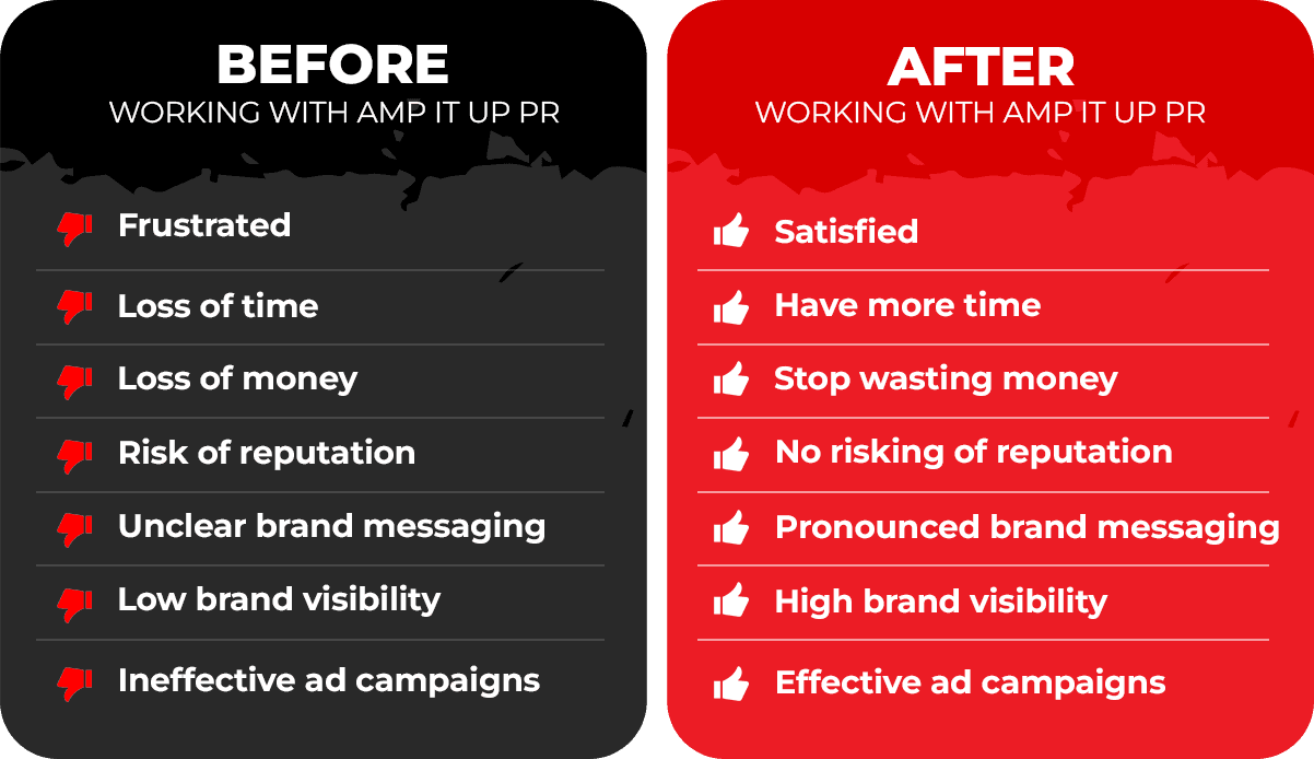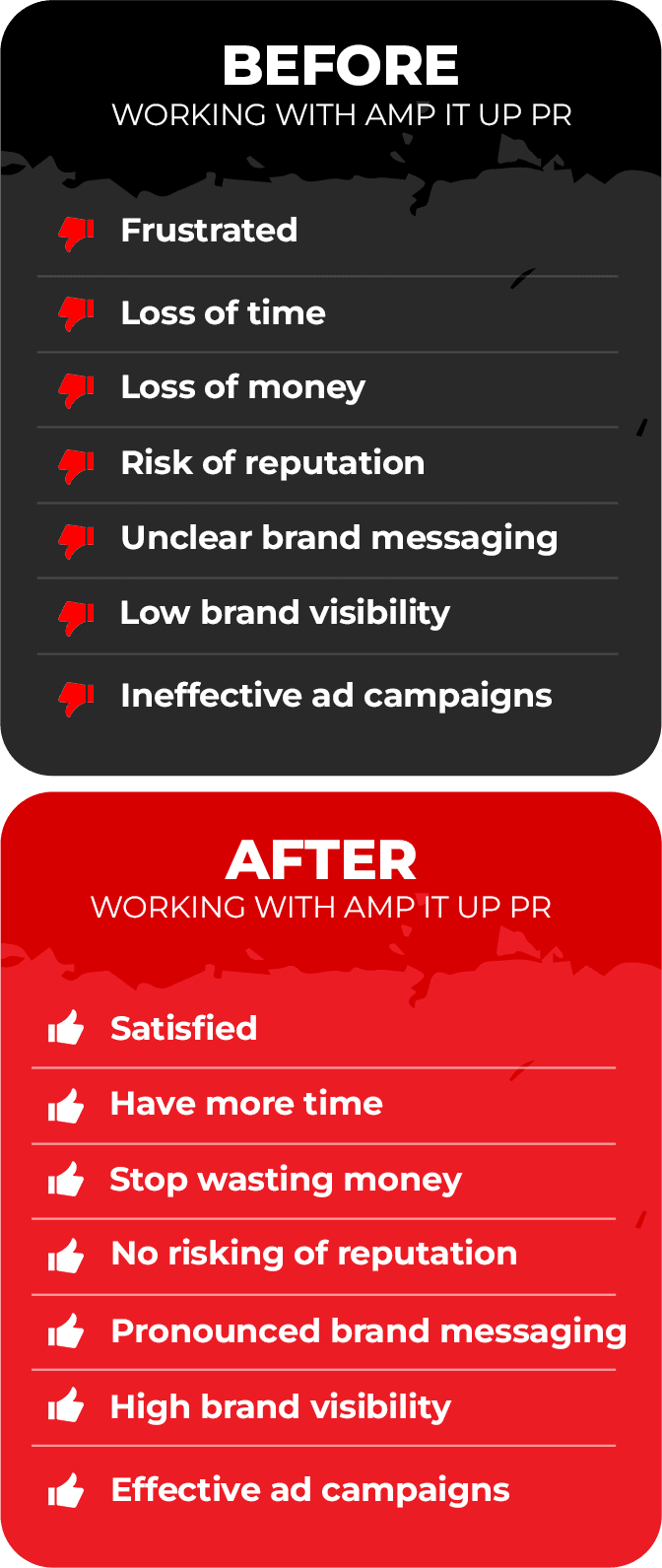 We are AMP It Up PR, an agency that regularly works with top media brands and Fortune 500 companies to help them achieve their goal of increasing their awareness while growing their sales.